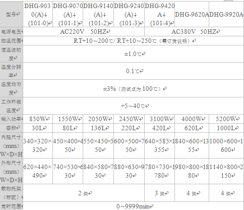 产品型号 DHG-9030、DHG-9030A、DHG-9070、DHG-9070A、DHG-9140、DHG-9140A、DHG-9240、DHG-9240A、DHG-9420A、DHG-9620A、DHG-9920A 产品特点 采用先进的激光、数控加工设备生产的产品;供工矿企业、化验室、科研单位等作干燥、烘焙熔蜡、灭菌用。 产品特点 ● 箱体内均采用镜面不锈钢氩弧焊制作而成,箱体外采用优质钢板,造型美观、***颖。 ● 采用具有超温偏差保护、数字显示的微电脑P.I.D温度控制器,带有定时功能,控温精确可靠。 ● 热风循环系统由能在高温下连续运转的风机和合适风道组成,提高工作室内温度均匀度。 ● 采用***型的合成硅密封条,能长期高温运行,使用寿命长,便于更换。 ● 可以从控温面板上调节箱内进风和排气量大小。 ● 独立限温报警系统,超过限制温度即自动中断,保证实验安全运行不发生意外。(选配) ● 可配打印机或RS485接口,用于连接打印机或计算机,能记录温度参数的变化状况。(选配) 技术参数